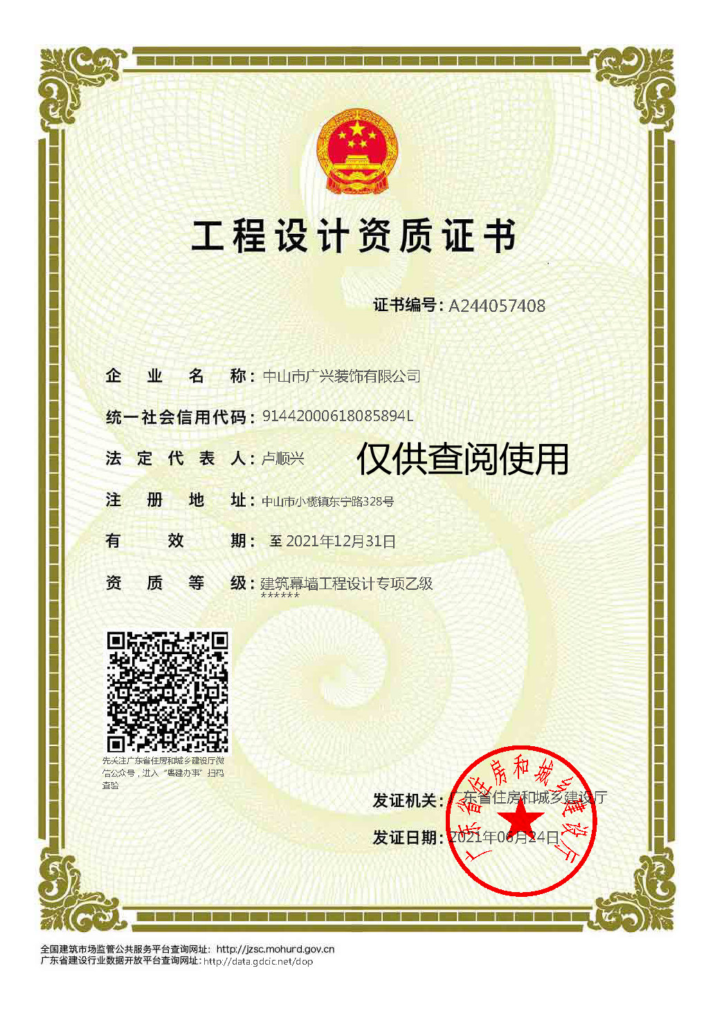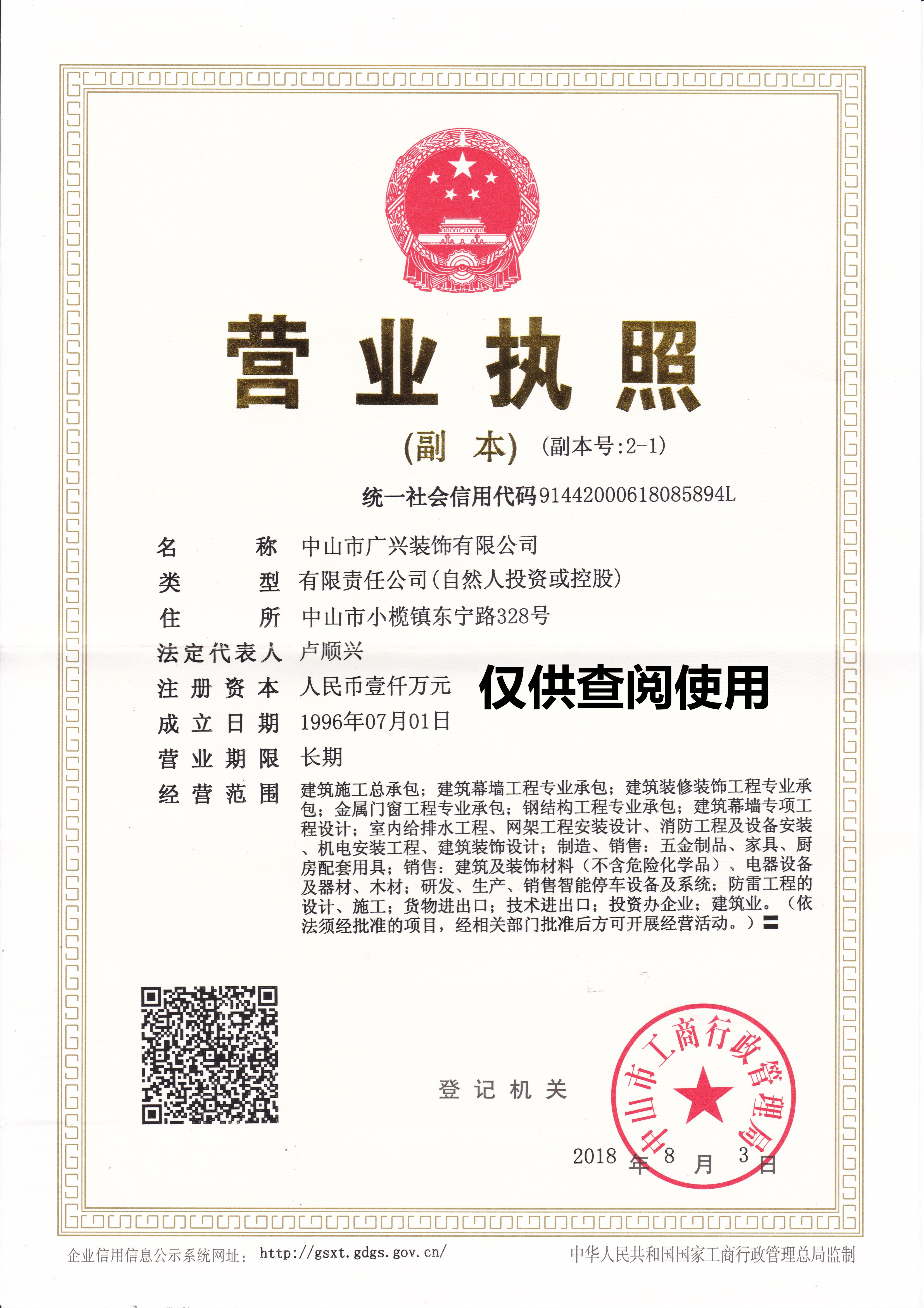 中山市廣興裝飾有限公司創(chuàng)建于1985年,是一家集鋼結(jié)構(gòu)、建筑、幕墻、裝修裝飾、鋁合金門窗專業(yè)的設(shè)計、加工及施工安裝為一體的大型綜合性建筑企業(yè)。公司總部位于中山市小欖鎮(zhèn),在中山和珠海均建有生產(chǎn)加工基地,總占地面積60000多平方米。